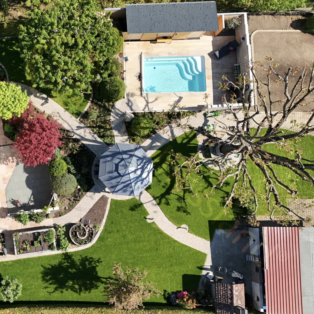 Sie, bzw. Ihr Garten-/Landschaftsbauer hebt die Grube aus und bringt ein Vlies und eine Kies-/Splittschicht von 10 cm ein.
